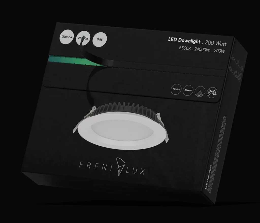The packaging was designed to stand apart from conventional lighting boxes through a darker premium palette, clean technical hierarchy, and restrained branding. Matte black surfaces create a modern architectural feel, while selective accent colors help organize wattage, size, or product range distinctions.